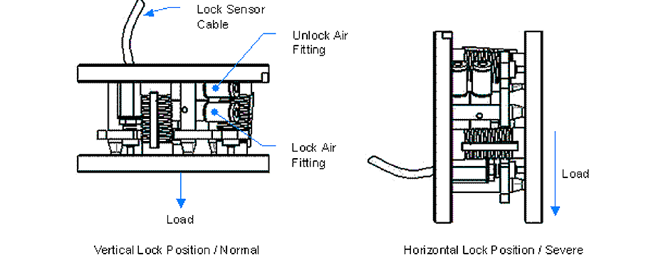 En las unidades equipadas con bloqueo se recomienda usar un suministro de aire de 60 a 120 psi (4,1 a 8,3 bar). En condiciones de bloqueo graves, el suministro de aire se puede ajustar a un máximo de 120 psi (8,3 bar). El bloqueo se opera mediante la aplicación de aire a la conexión deseada (bloqueo o desbloqueo). La conexión opuesta debe ser vaciada para que el cilindro funcione correctamente. Se recomienda bloquear la unidad en posición vertical. Esto crea una condición de bloqueo normal. Una condición de bloqueo grave se produce cuando la unidad está bloqueada en la posición horizontal bajo una carga. En tal condición, la carga se eleva por el mecanismo de bloqueo (ver la imagen a continuación).