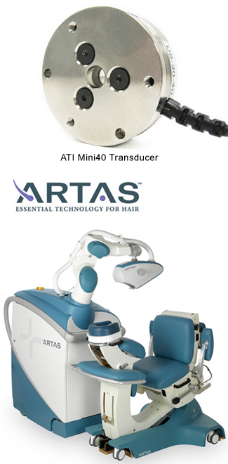 Restoration Robotics is dedicated to revolutionizing the field of hair transplantation. They developed the ARTAS™ System, the first and only FDA cleared, physician-controlled, interactive, computer-assisted technology that allows safe and effective follicular unit extraction. The ARTAS System was developed in close collaboration with leading hair restoration physicians to enable minimally-invasive harvesting of follicular units. This computer-assisted medical device uses an image-guided robotic arm to identify and harvest individual follicular units. Mounted on the robot arm, between the robot flange plate and the follicular unit harvester, or end-effector, the ATI Mini40 Model Sensor, provides feedback used to closely monitor forces exerted by the end-effector. Robert Roy, senior director of product development at Restoration Robotics, states, "We chose ATI's Mini40 Model Sensor because of its ability to measure applied loads in six degrees of freedom with a high resolution, in a uniquely small size."